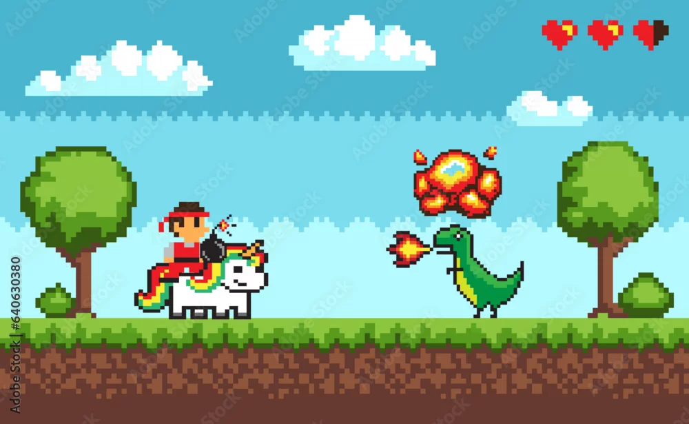 Pixel game scene. Vector illustration. Pixelated hero on unicorn fight with dragon monster with fire. Old style 8bit pixel game with bright landscape. 8-bit adventure video-game. Pixel art style