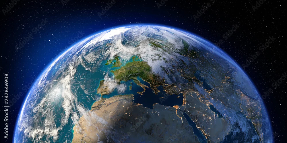 Planet Earth with detailed relief and atmosphere. Day and Night. Europe, North Africa and Middle East. 3D rendering. Elements of this image furnished by NASA