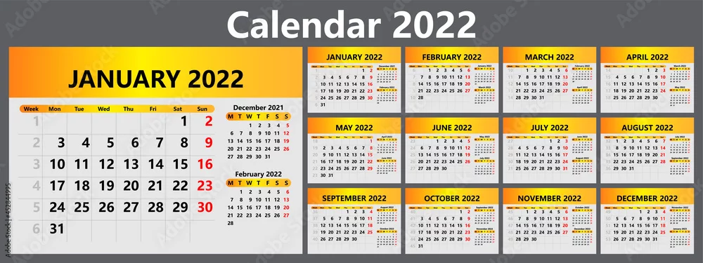 Planner calendar for 2022 with week numbers. Template for a wall calendar for a company. The week starts on Monday. Vector illustration
