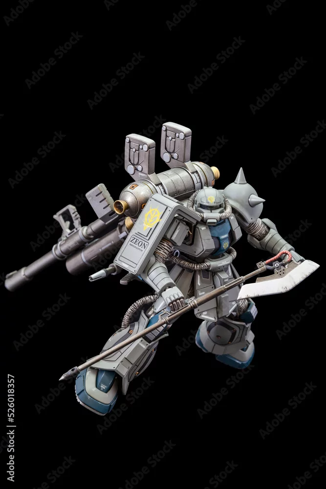 plastic model of gundam from the gundam series of animated tv shows. the model is posed on a black background and is manufactured by bandai