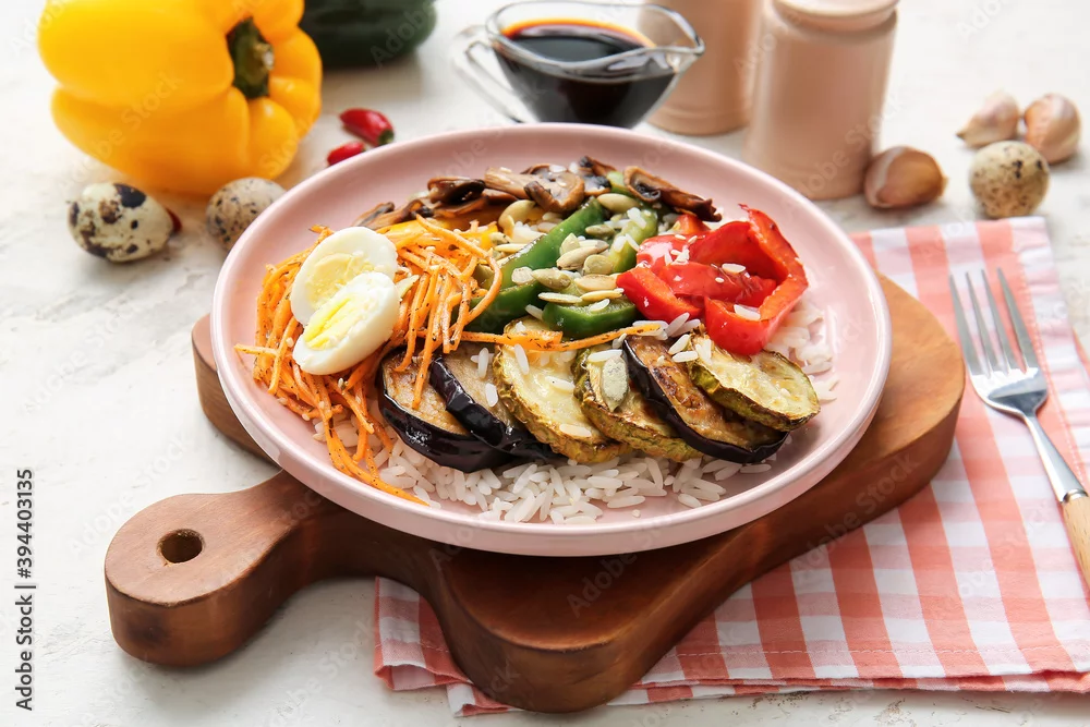 Plate of delicious rice salad with vegetables on light background
