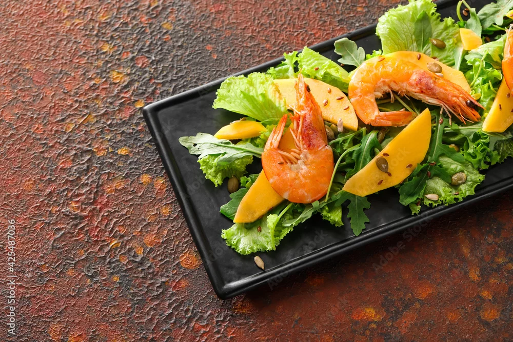 Plate of fresh mango salad with shrimps on grunge background