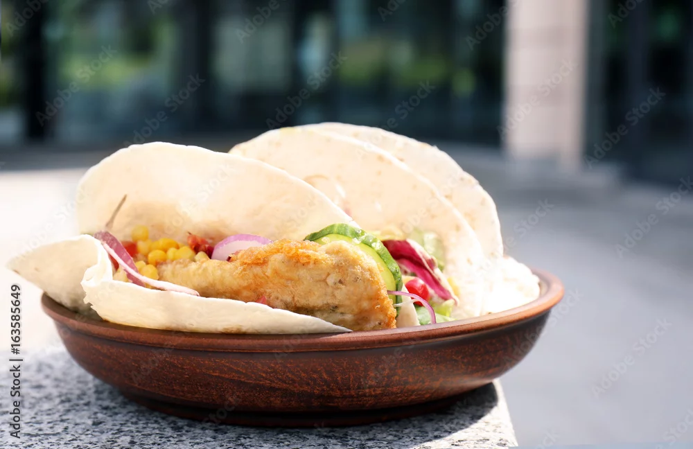 Plate with delicious fish tacos outdoor