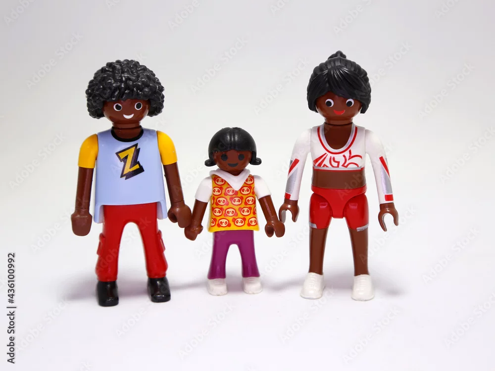 Playmobil dolls. African American family. Happy family. Mother, father and son. Mom, dad and child. Young family united. Happiness. Man, woman and child. Toy for boys and girls. Siblings. Friends.