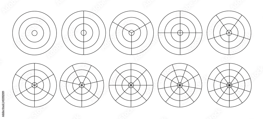 Polar grid concentric circles and steps. Blank vector polar graph paper. Radar circular graph screen. Grid with concentric circles diagram. Vector