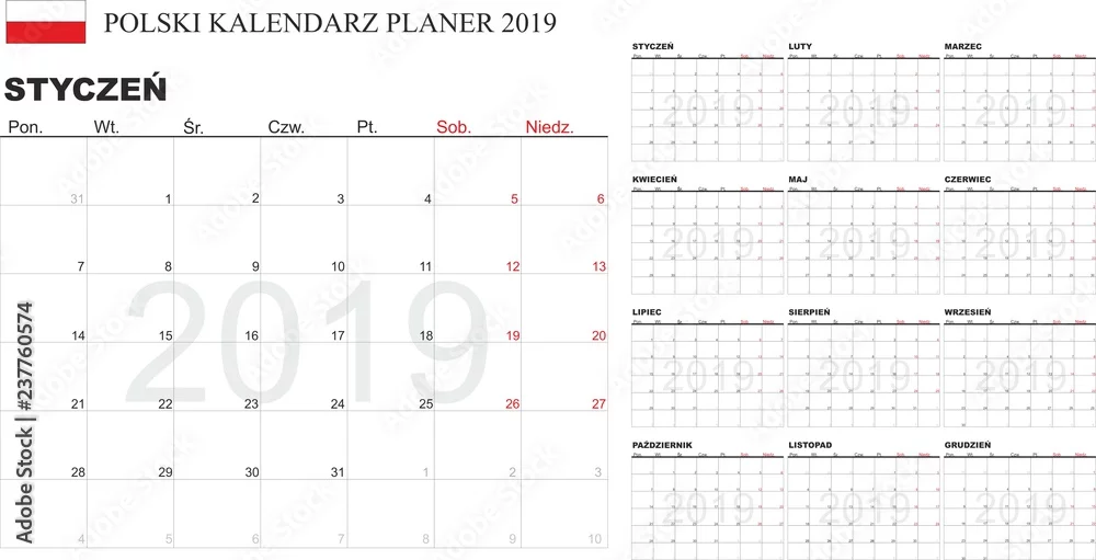 Polish Calendar 2019, Kalendarz polski 2019, monthly planning, Polish calendar template for year 2019, set of 12 months, printable calendar vector