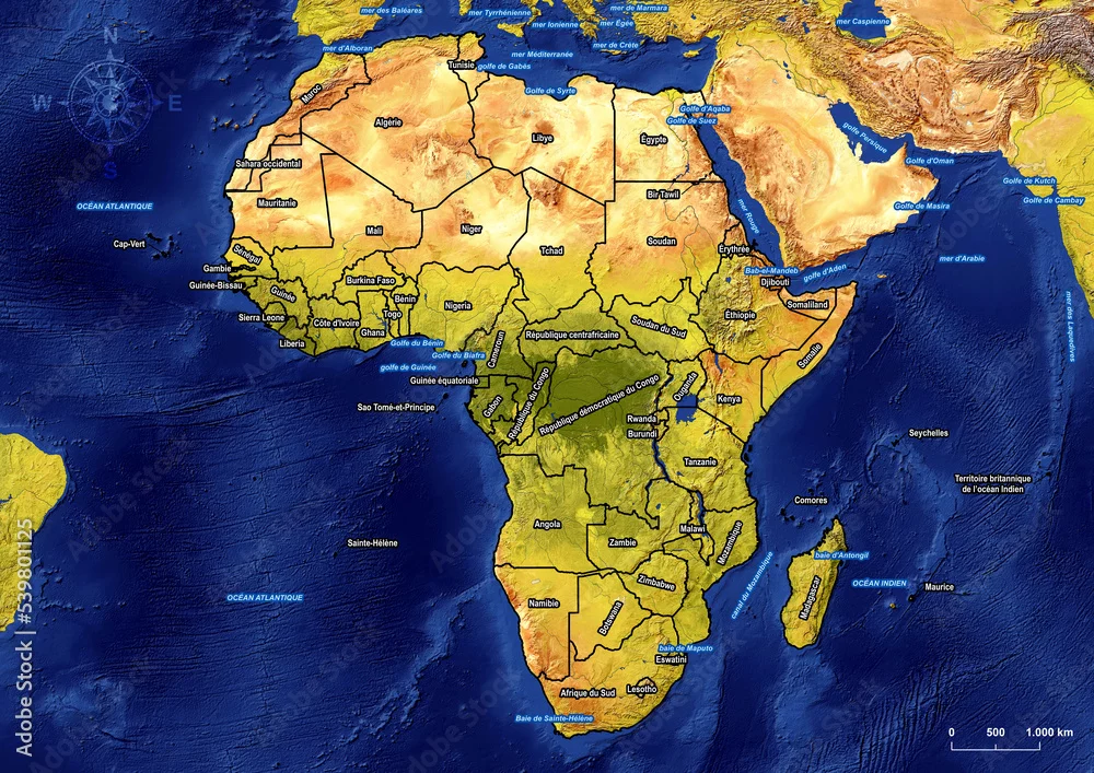 Political Map of Africa with marine areas in french on large and detailed satellite image (Satellite-derived land cover data with Shaded Relief, Water, ...