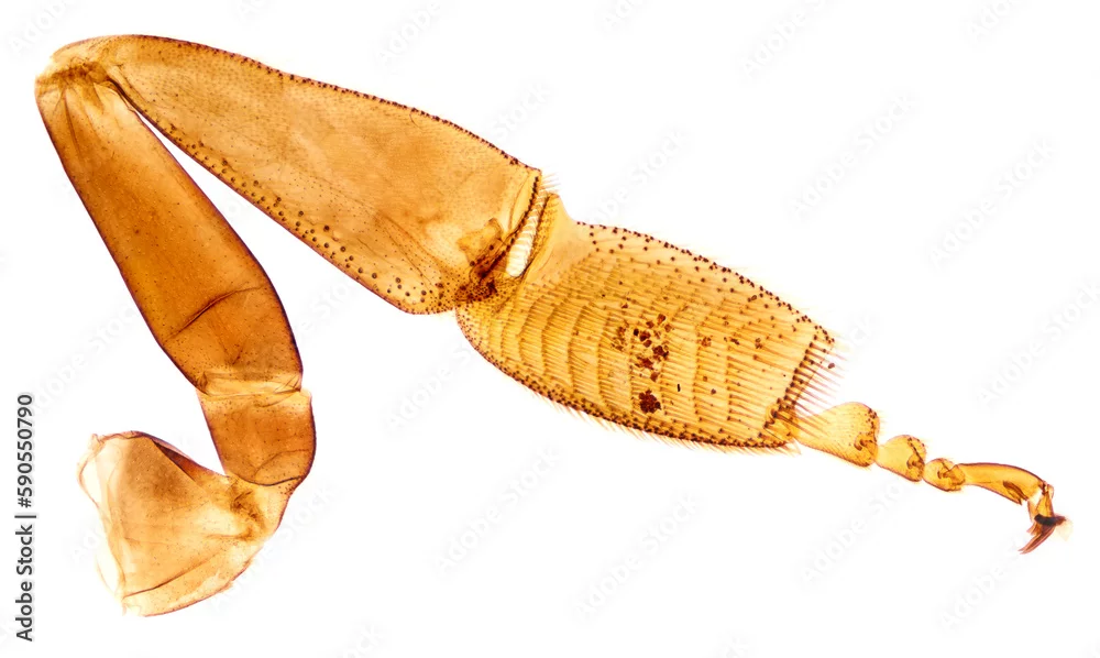 Pollen on a honeybee leg, whole mount, 8X light micrograph. Pollen-carrying leg of a honey bee, Apis, under a light microscope. Three photos combined into one picture. Isolated on white background.
