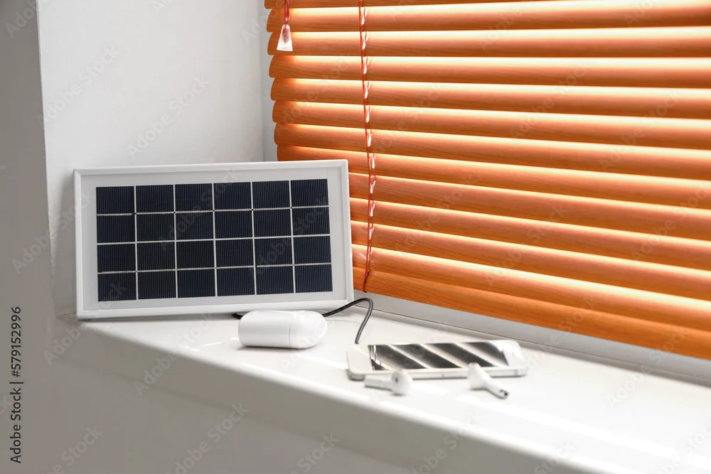 Portable solar panel charging mobile phone and earphones on windowsill in room