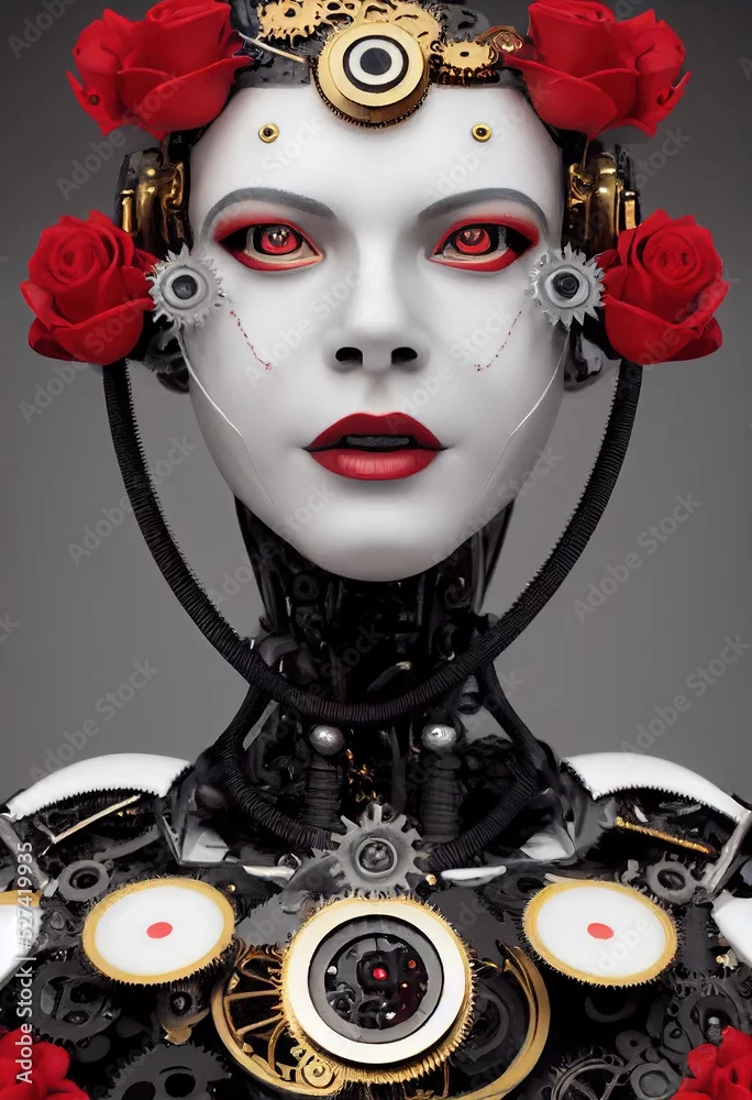 Portrait of a Victorian steampunk female robot. Artistic abstract steampunk fantasy. Vintage robot with red roses. 3d rendering,