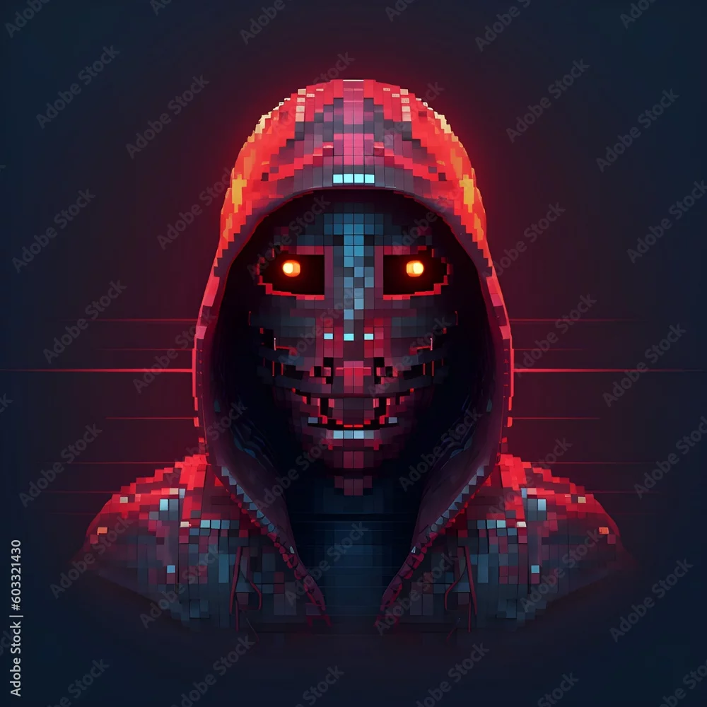 Portrait of anonymous cyborg hacker. Concept of hacking cybersecurity, cybercrime, cyberattack, pixel art style ai generative
