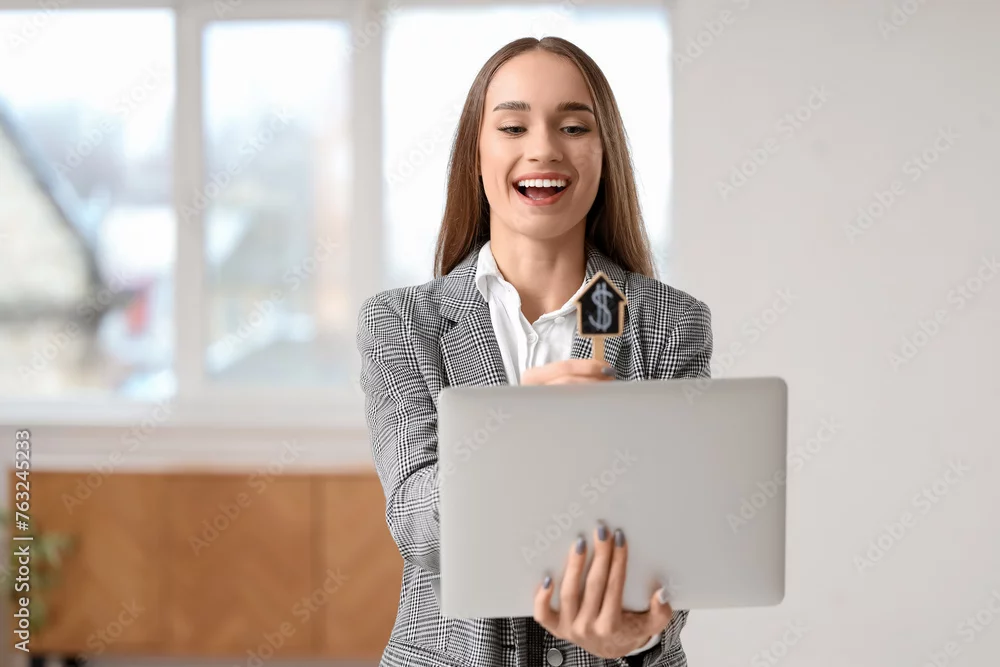 Portrait of female real estate agent with laptop in new apartment