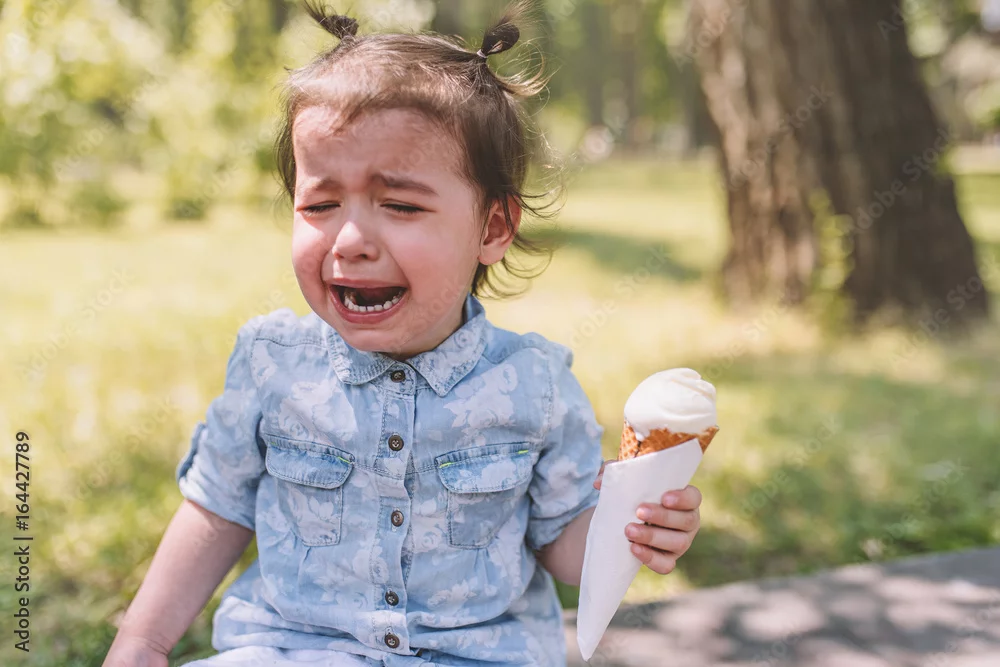 Portrait of sad kid crying with ice-cream cone in hand in the park. Funny little cute girl toddler frustrated to eat dessert outdoor against nature background. ...