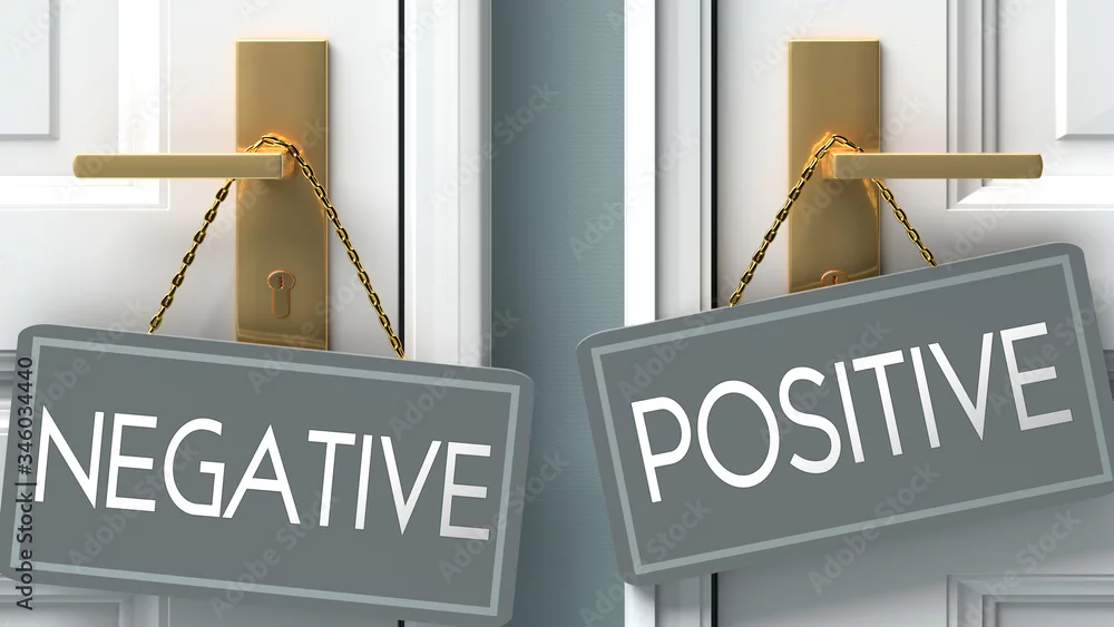 positive or negative as a choice in life - pictured as words negative, positive on doors to show that negative and positive are different options to choose from, 3d illustration