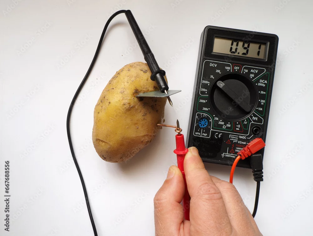 Potato battery. Generating electric from a potato and measuring its with voltmeter. Electrical voltage at millivolts levels. Bio battery.