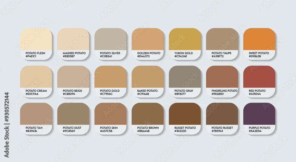 Potato Color Palette, Potato Brown Color Guide Palette with Color Names. Catalog Samples of Potato colors with RGB HEX codes. cladding sheet Brown colour, Fashion Trend Potato Brown Color Palette