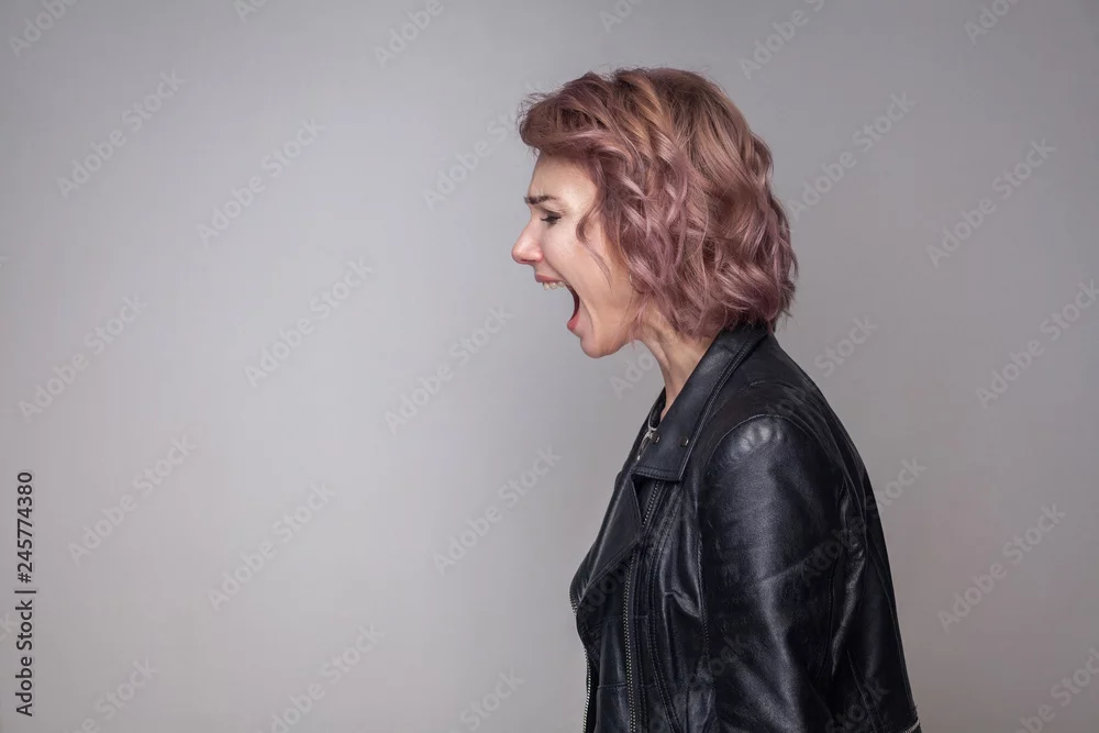 Profile side view portrait of angry girl with short hairstyle and makeup in casual style black leather jacket standing and screaming with closed eyes. indoor studio shot, isolated on grey background.