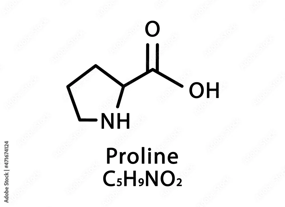 Proline molecular structure. Proline skeletal chemical formula. Chemical molecular formula vector illustration