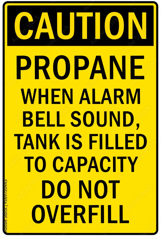 Propane warning sign and labels when alarm bell sound, tank is filled to capacity do not overfill