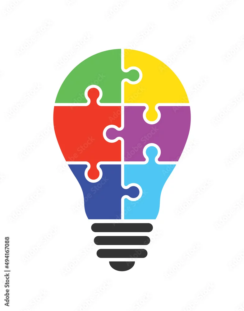Puzzle light bulb icon. Lightbulb, lamp with jigsaw inside, logo idea, business concept of innovation. Creative flat design solution with puzzle pieces. ...