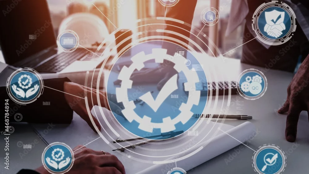Quality Assurance and Quality Control conceptual - Modern graphic interface showing certified standard process, product warranty and quality improvement technology for satisfaction of customer.