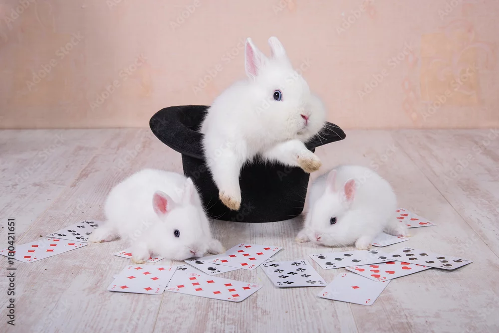 Rabbit in a top hat and little rabbits with playing cards
