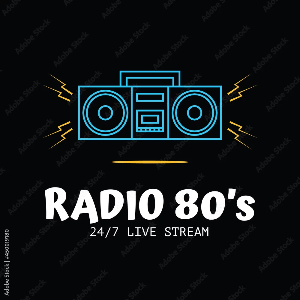 Radio show logo. Line art logo of a floating and louder tape recorder radio with double speakers, with ‘Radio 80’s’ logo text below and ’24/7 Live Stream’ ...