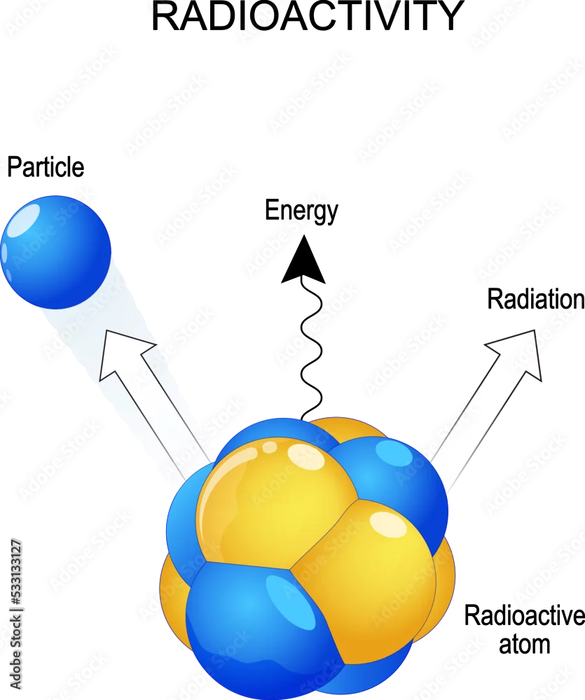 radioactivity and radiation rays. Close-up of radioactive atom, and particle