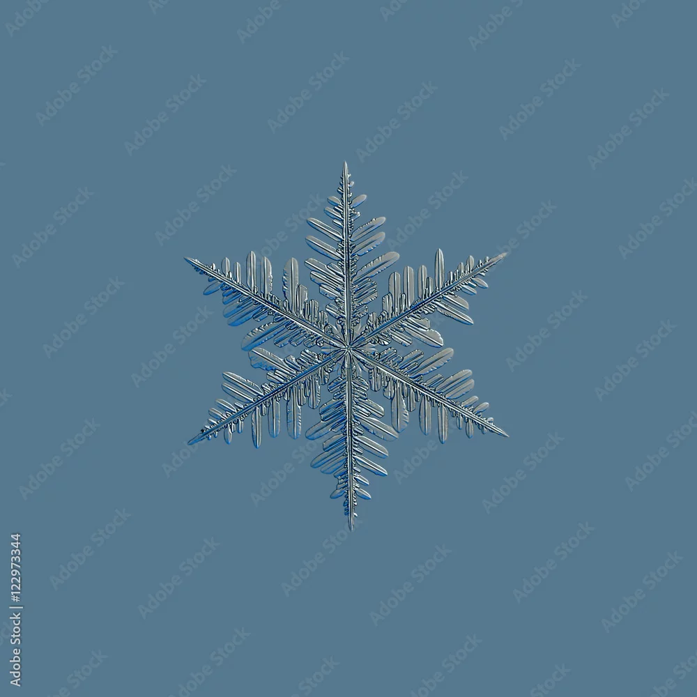 Real snowflake photo (medium size fernlike stellar dendrite), isolated on uniform blue background