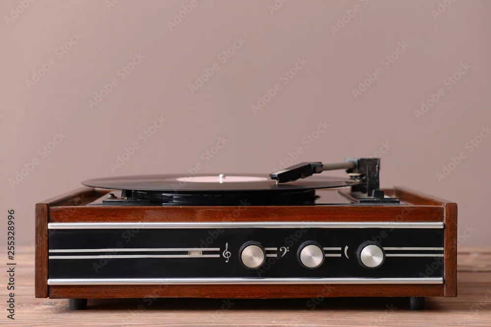 Record player with vinyl disc on table