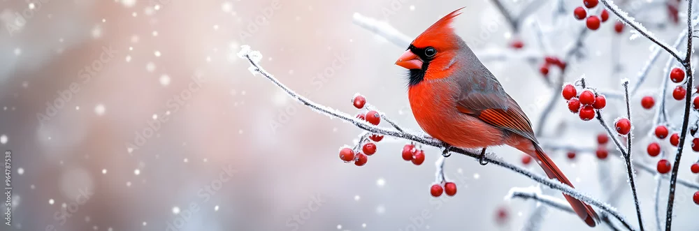 Red cardinal bird on a frosty tree branch with snow red berries in winter, Holiday and Christmas web banner with copy space