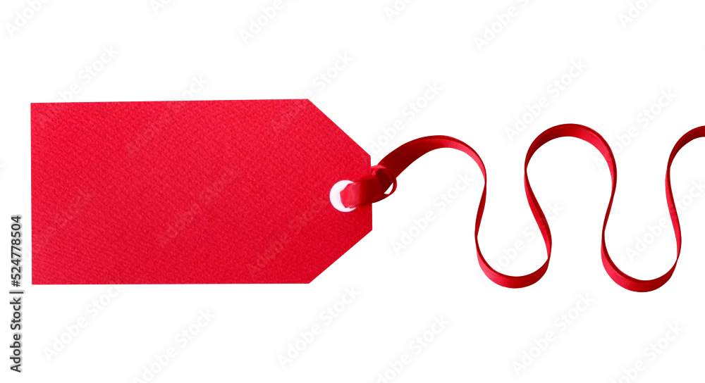 Red gift tag with ribbon plain blank straight isolated transparent background photo PNG file