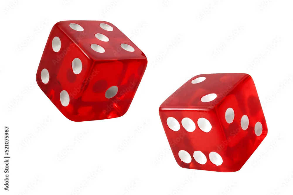 Red pair of casino dice rolled a seven with each die rolling a five and two isolated on white background with clipping path cutout concept for games of chance, taking a risk and luck in gambling