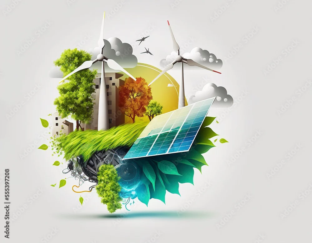 Renewable energy background with green energy as wind turbines and solar panels. Generative AI