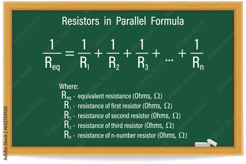 Resistors in Parallel Formula on a green chalkboard. Education. Science. Formula. Vector illustration.