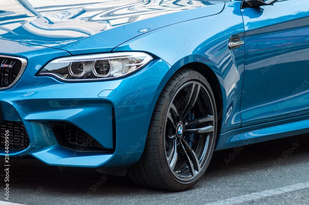 retail of blue coupe BMW M3 parked in the street. BMW is a german brand multinational company which currently produces automotive