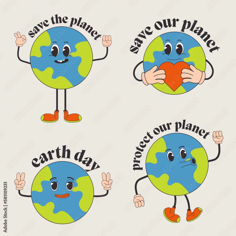 Retro earth cartoon character. Earth Day. Save planet conception. World Environment Day. Trendy groovy 70s style illustration.