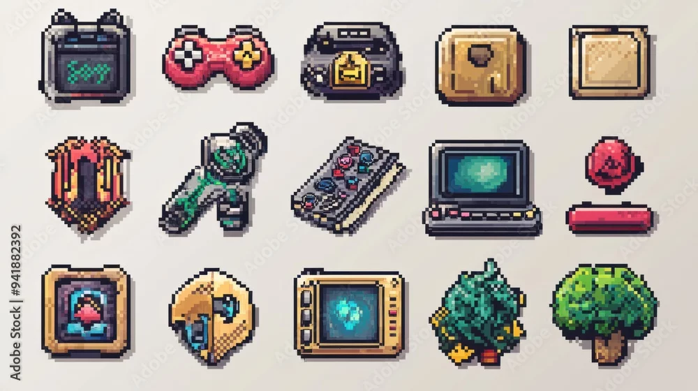 Retro Pixel Art Icon Set - Nostalgic Gaming Symbols in Classic 8-bit Style
