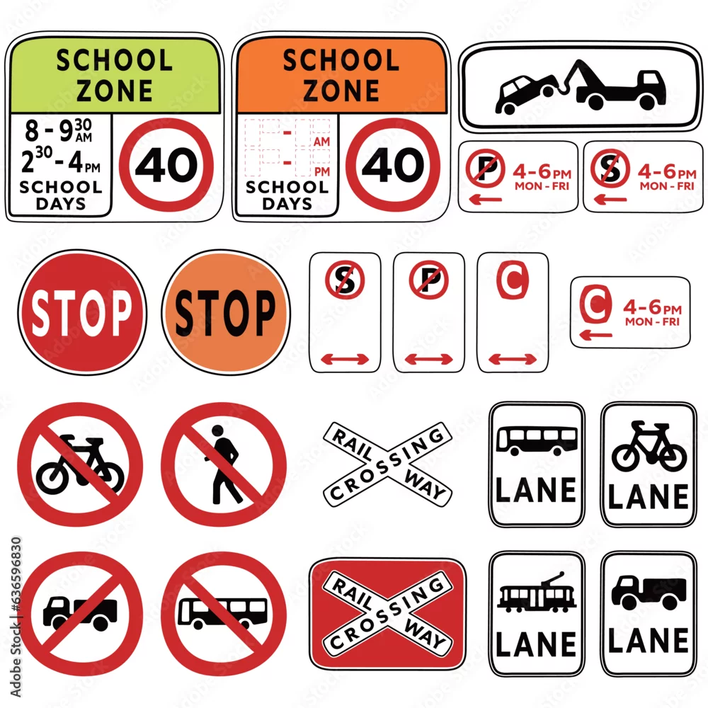 Road signs collection vector. Traffic signs. School Zone, No Stopping, No Parking, No Stopping at times, No Parking at Times, Clearway, Clearway at times, ...