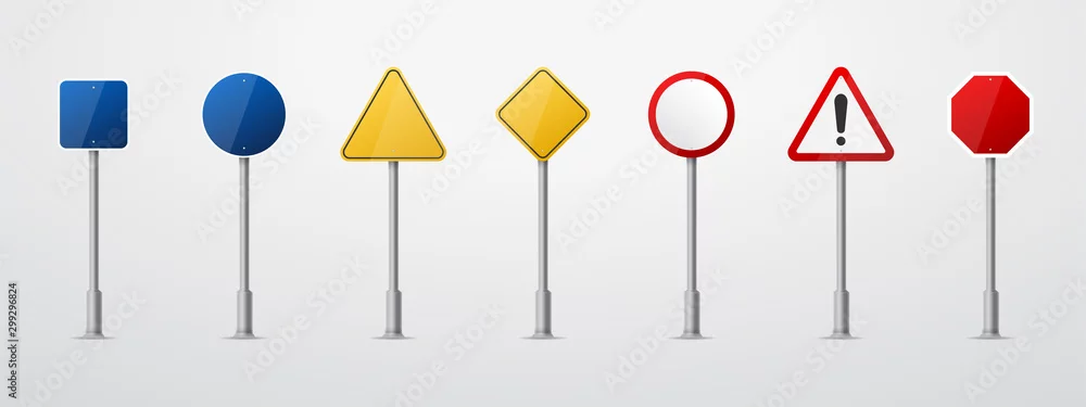 Road signs. Vector red, green and yellow empty road sign mock up with place for text or symbol