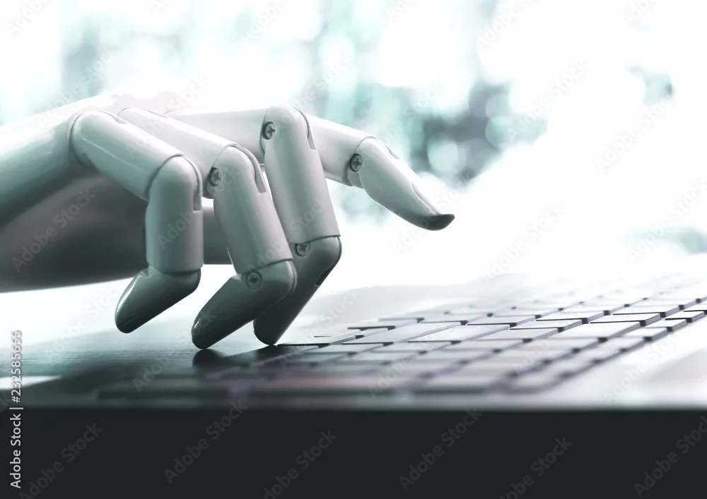 Robot concept or robot hand chatbot pressing computer keyboard enter