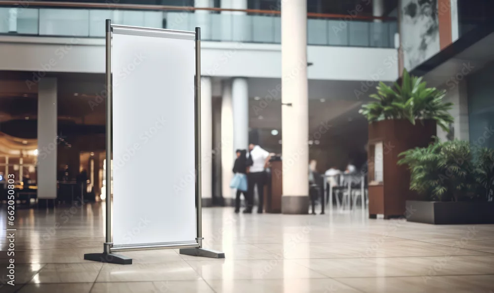roll up mockup poster stand in an shopping center restaurant mall environment as poster stand banner design with blank empty copy space area