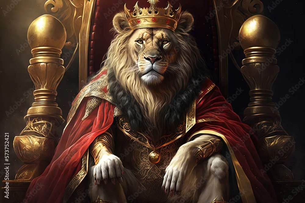 Royal lion wearing a gold crown and red cloak sitting on a golden and red throne. Golden shining king of beasts lion on a royal golden throne.AI generative ...