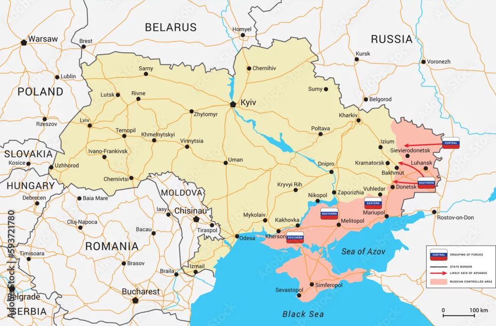 Russian invasion of Ukraine map. Vector map with occupied territory, cities and main roads. Status as of April 2023. Full editable map.