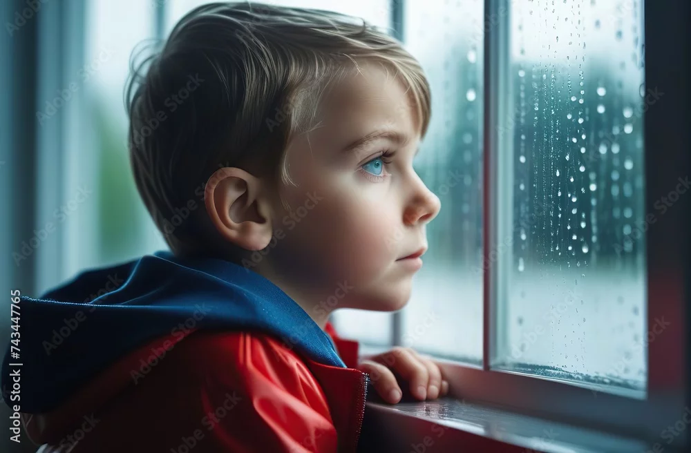 Sad cute child looking trough the window on a rainy day. Pensive child looking out window during rainy day. Thoughtful young child standing by window looks ...