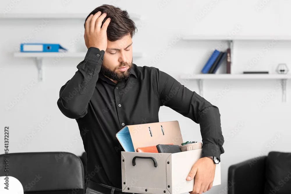 Sad fired young man holding box with personal stuff in office