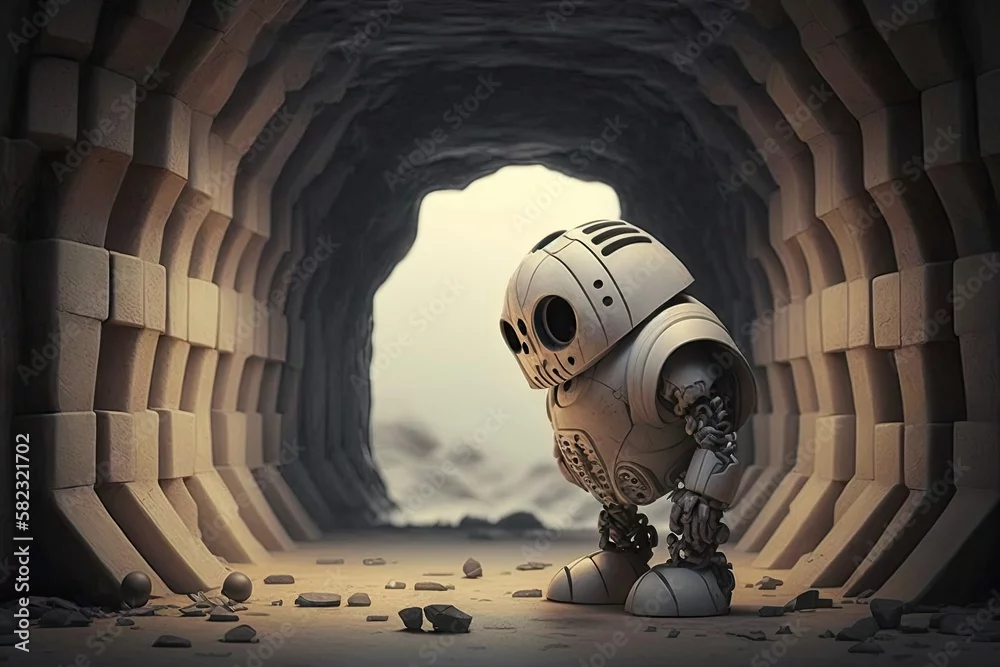 sad robot in futuristic style with shell on end of tunnel, created with generative ai