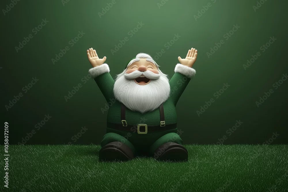 Santa Claus figurine in a green suit sitting on grass with raised arms celebrating the festive season in a unique Christmas scene that blends holiday cheer ...