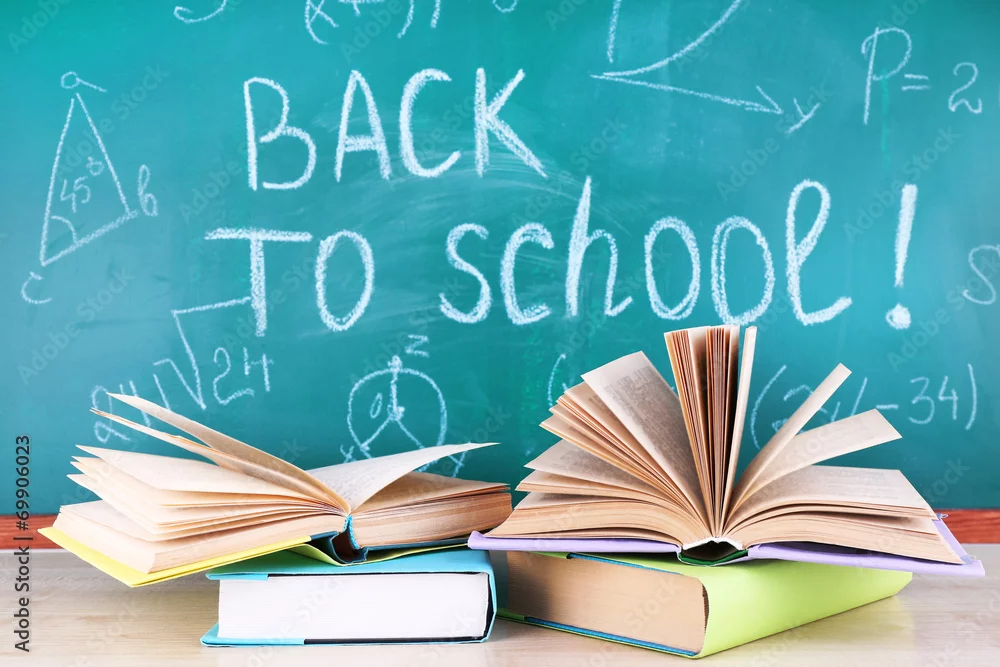 School supplies on table on blackboard background