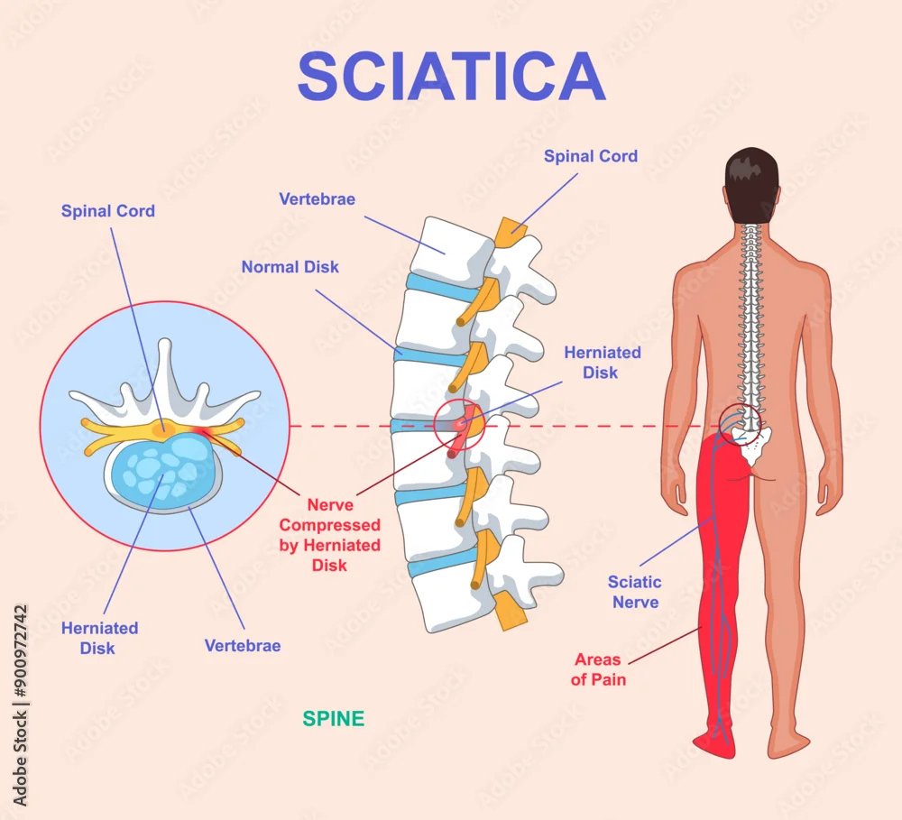 Sciatica medical diagram. Anatomical scheme with human spine, nerves and intervertebral disc. Infographic with sciatic nerve compression and leg pain. ...